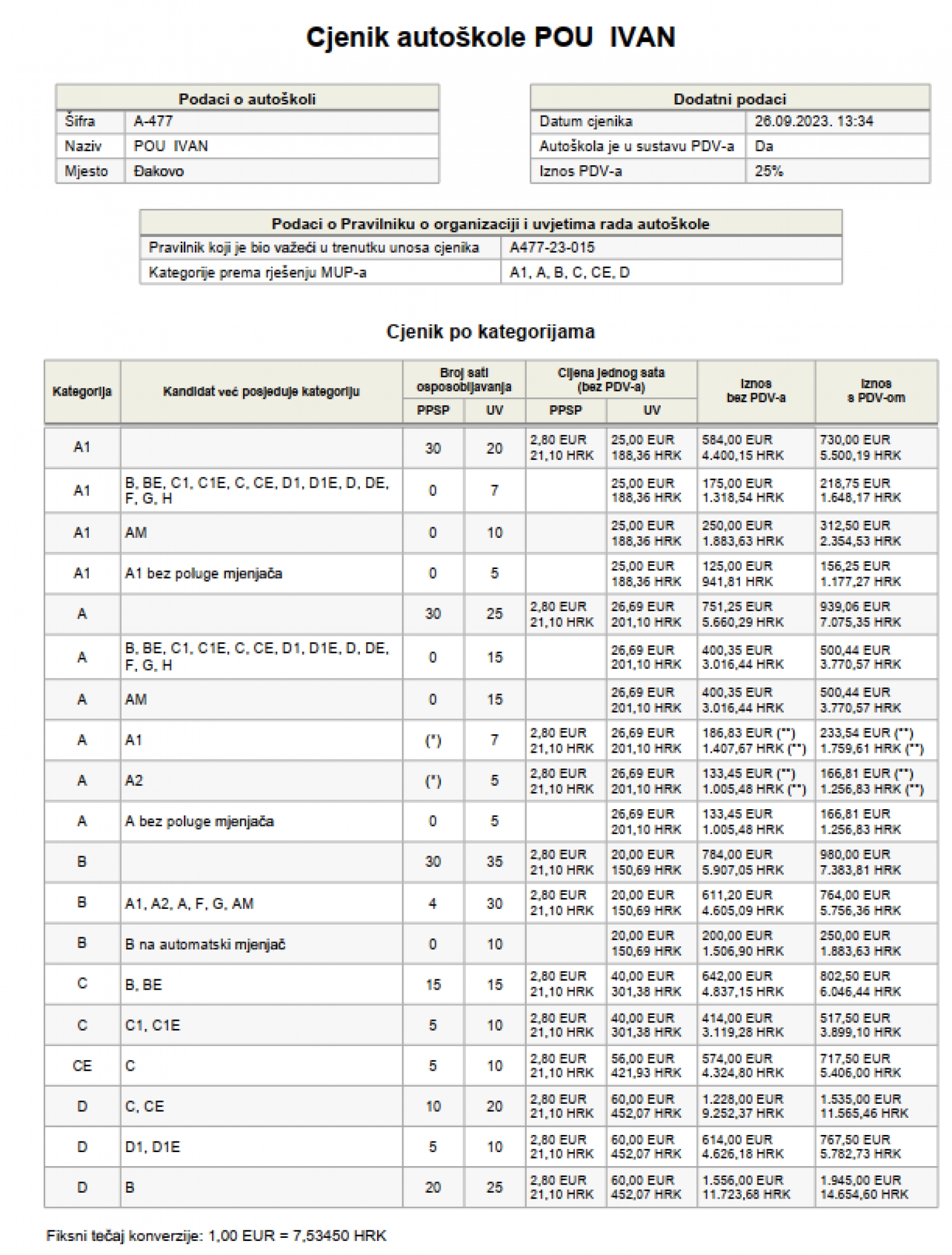 Napomena: temeljem čl. 202. st. 1. točka 6. Zakona o sigurnosti prometa na cestama POU IVAN samostalno donosi cjenik za osposobljavanje kandidata za vozača i može formirati drugačiju cijenu u skladu sa zahtjevima kandidata za vozače, odnosno, naručitelja usluge. Naknada za ispis iznosi 39,82 EUR. Naknada za provedbu ispita iz UMV-a obračunava se prema jediničnoj cijeni sata vožnje za kategoriju koju se polaže. Dodatni sati obračunavaju se prema Ugovorom utvrđenom jediničnom satu.